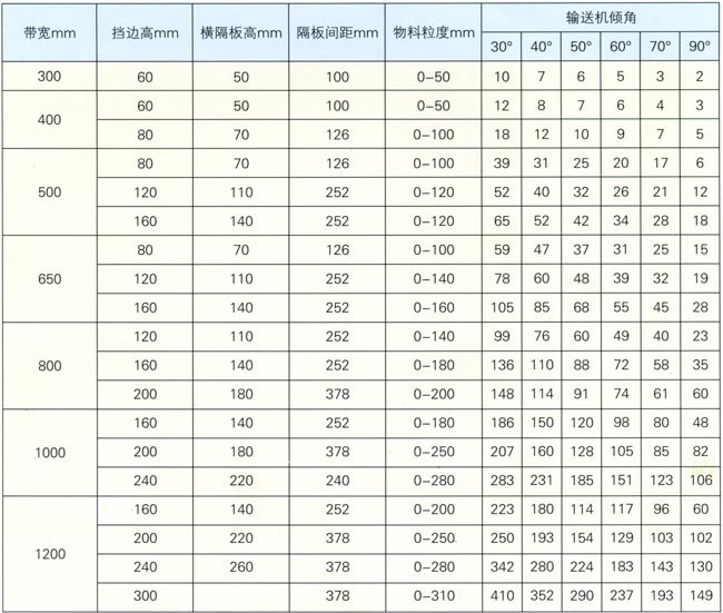 DJ型大大傾角波形擋邊帶式輸送機能力(帶速1m/s) (m3//h)